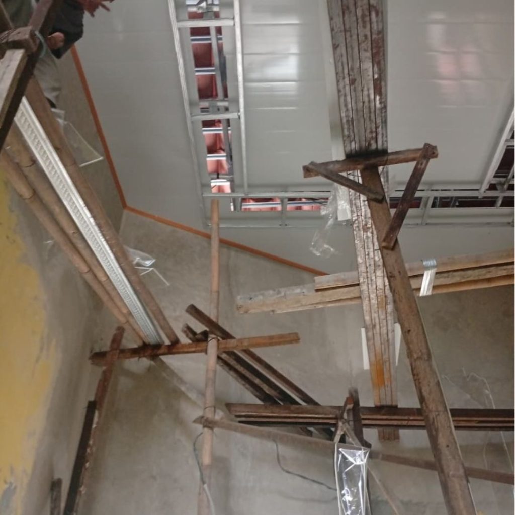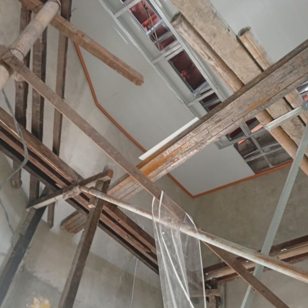 - Perbaikan dan perapihan rangka plafon lama sebelum pemasangan baru.
